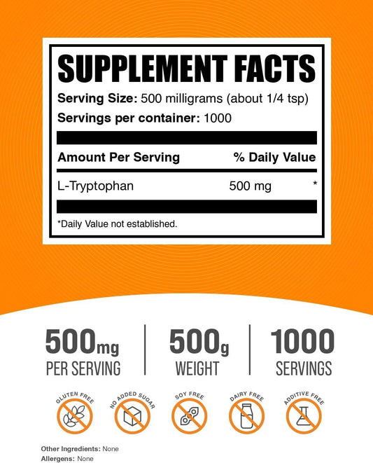 BulkSupplements.com L-Tryptophan Powder - 500g (1.1 lbs) - Amino Acid Supplement, Gluten Free - 500mg per Serving - Pack of 1Vendor:BulkSupplementsRegular price $146.79 AUDRegular priceUnit price / per