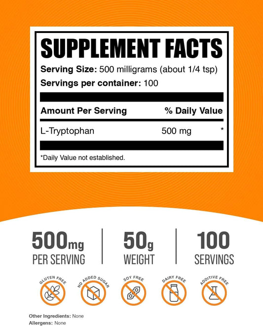 BulkSupplements.com L-Tryptophan Powder - 500mg Tryptophan Supplement, Amino Acid, Gluten Free - 50g (1.8 oz) Pack of 1Vendor:BulkSupplementsRegular price $102.34 AUDRegular priceUnit price / per-