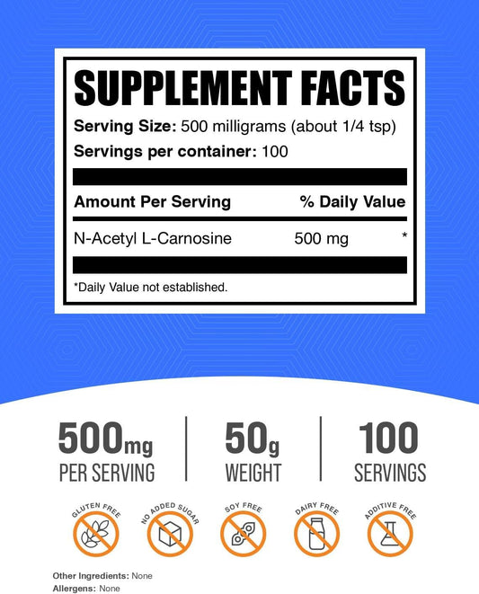 BulkSupplements.com N-Acetyl L-Carnosine Powder - 500mg per Serving, Gluten Free - 50g (1.8 oz) - Carnosine Supplement PackVendor:BulkSupplementsRegular price $208.23 AUDRegular priceUnit price / per-
