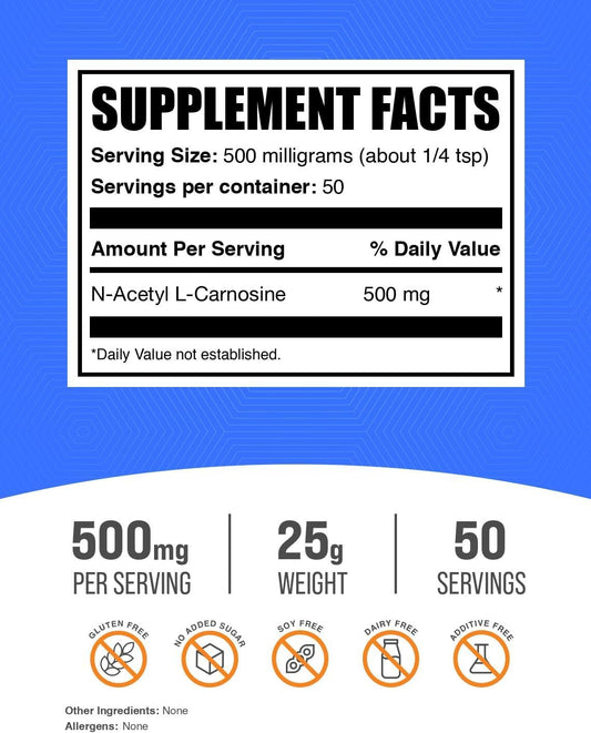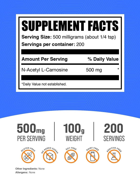 BulkSupplements.com N-Acetyl L-Carnosine Powder - 500mg Carnosine Supplement, Gluten Free, 25g (0.88 oz) - Pack of 1Vendor:BulkSupplementsRegular price $153.03 AUDRegular priceUnit price / per-