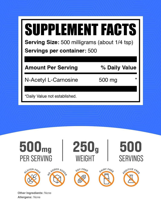 BulkSupplements.com N-Acetyl L-Carnosine Powder - 500mg per Serving, Gluten Free Carnosine Supplement - 250g (8.8 oz) - Pack of 1Vendor:BulkSupplementsRegular price $396.92 AUDRegular priceUnit price / per-
