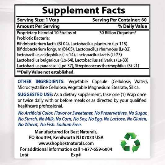 High Potency Probiotic with 10 Strains & 30 Billion CFU for Intestinal Health - 60 Veggie Capsules