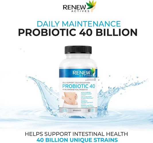 Renew Actives 40 Billion CFU Probiotic Supplement for Digestive Health - Daily Relief for Bloating & Regularity - Double Strength Formula for Men & Women - 60 Capsules