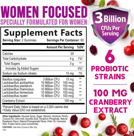 Women's Probiotic Gummies for Digestive & Vaginal Health - 3 Billion CFU with 6 Strains & Cranberry - Non-GMO - 120 Gummies