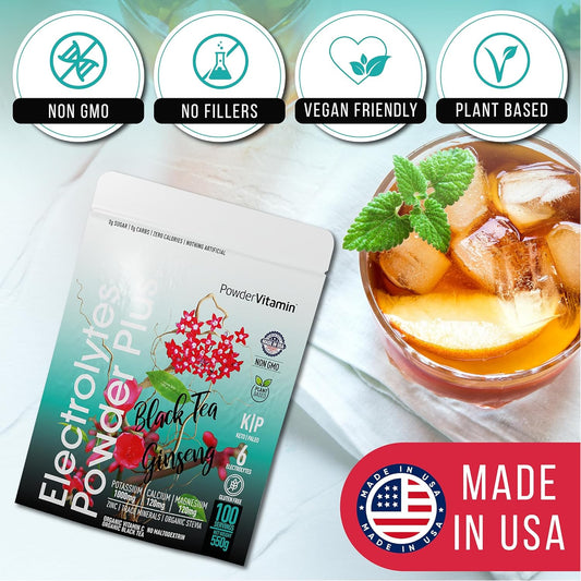 100 Servings Powder Vitamin Electrolytes Black Tea Ginseng Powder with Pink Himalayan Salt - Keto, Sugar Free, 1000mg Potassium, 120mg Calcium, 120mg Magnesium - Hydration Powder