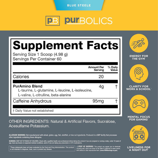 Blue Steele Amino Energy Drink Mix | Supports Recovery, Energy, Focus | 95mg Caffeine, 0 Cal, 60 Servings