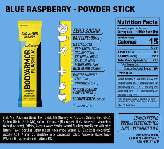 BODYARMOR Flash IV Electrolyte Packets, Lemon Lime - Zero Sugar Coconut Water Drink Mix (15 Count)