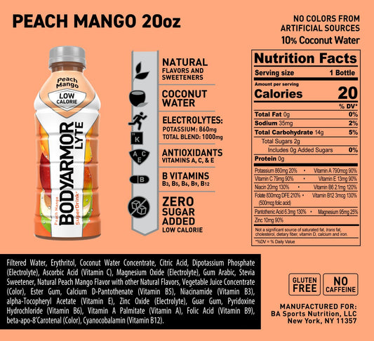 BODYARMOR LYTE Peach Mango Coconut Water Sports Drink - Low-Calorie Hydration With Electrolytes and Vitamins - 20Fl Oz (Pack of 6)