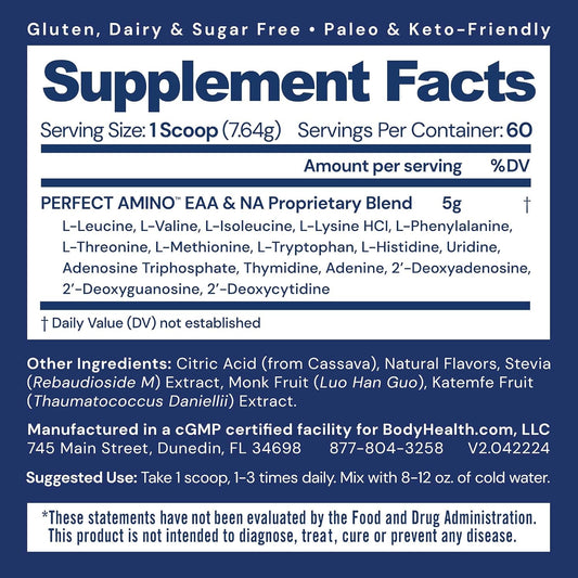 BodyHealth PerfectAmino Powder - BCAA and EAA Pre/Post Workout Drink - Energy Boost for Muscle Recovery - Lemon Lime Flavor - 60 Servings