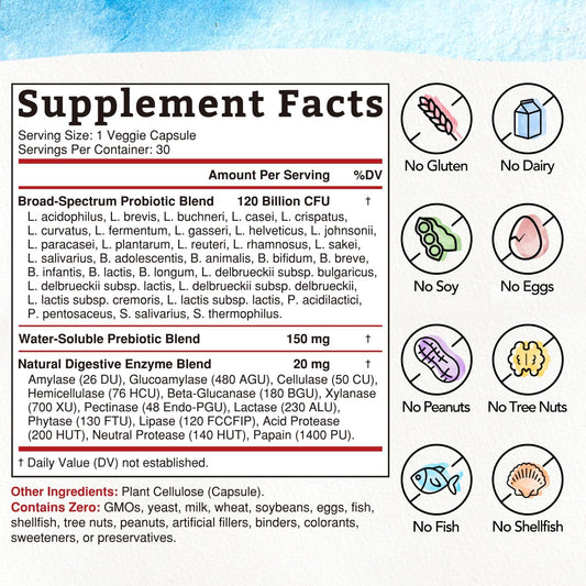 Bonawell Probiotics 120 Billion CFU 32 Strains with Prebiotics and Digestive Enzymes - 3-in-1 Daily Probiotic for Gut Health - 30 Veggie Capsules