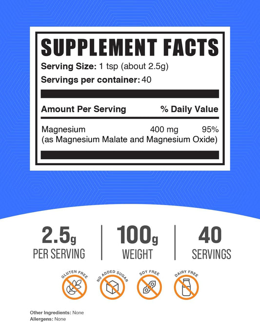 BulkSupplements Magnesium Malate Powder - 100g (3.5 oz) Pure Magnesium Supplement - Gluten Free - 2500mg (400mg Magnesium) per Serving