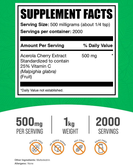 BulkSupplements.com Acerola Cherry Extract Powder - Vegan & Gluten Free, 500mg per Serving, 1kg (2.2 lbs) - Natural Vitamin C Powder