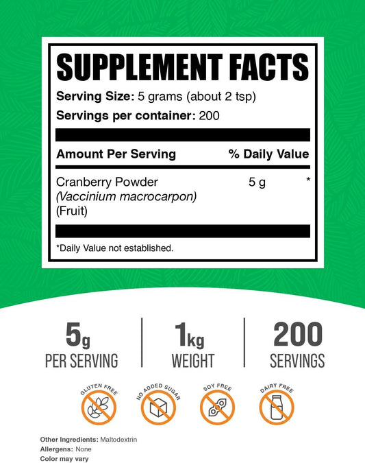 BulkSupplements.com Cranberry Powder - Unsweetened Dried Cranberry Supplements for Men & Women - Gluten & Sugar Free - 1kg (2.2 lbs) Pack