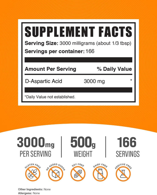 BulkSupplements.com D-Aspartic Acid Powder - 3000mg DAA Supplement for Men & Women - Unflavored, Gluten Free - 500g (1.1 lbs)