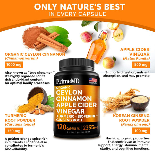 Bundle: PrimeMD Liquid Biotin Collagen Keratin Saw Palmetto Drops (2 fl oz - 2 Pack) & Ceylon Cinnamon w Turmeric & Ginseng Root (120ct) - Hair, Skin, Nails, Immune Support