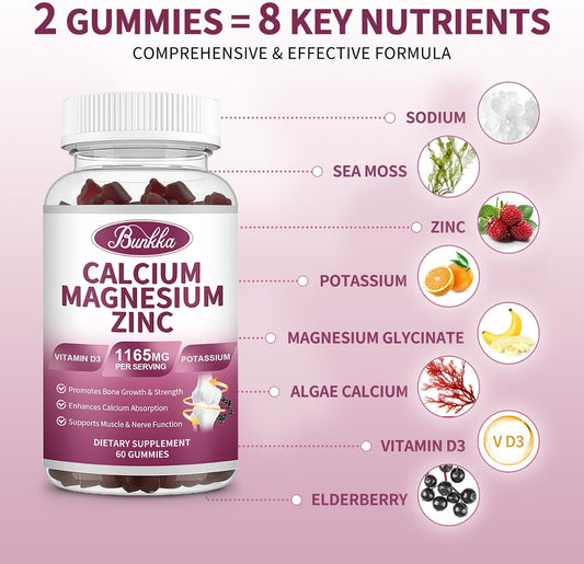 Bunkka Calcium Magnesium Zinc Gummies with 200mg Magnesium Glycinate, Potassium, D3, Sea Moss - Mood & Sleep Support for Kids & Adults (2 Pack)