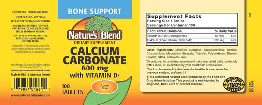 Calcium Carbonate with D3 400 IU 100 Tablets (Pack of 2) - Nature's Blend - 600 mg