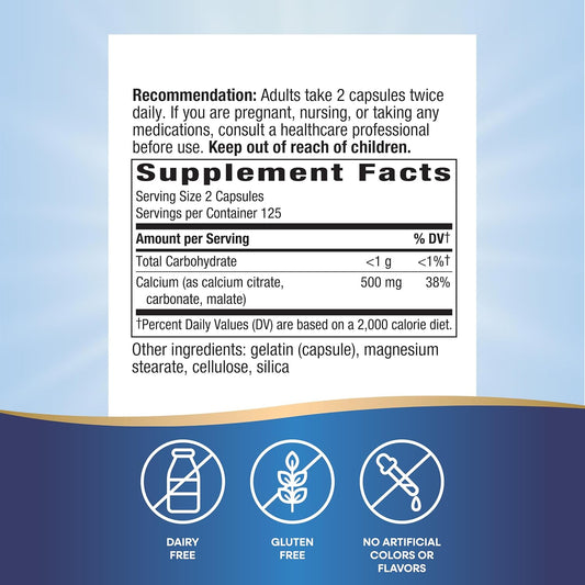 Calcium Citrate Supplement for Bone Health & Muscle Function - 500mg per Serving - Citrate, Carbonate & Malate Blend - Gluten Free - 250 Capsules (2 Pack)