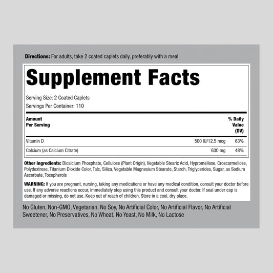 Calcium Citrate with Vitamin D3 Caplets for Women and Men - 630 mg - 220 Count - Vegetarian, Non-GMO, Gluten Free