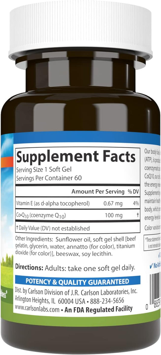 Carlson Co-Q10 100mg Softgels for Energy and Heart Health - 60 Count