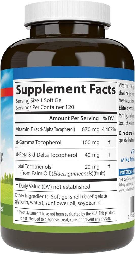 Carlson E-Gems Elite Vitamin E Soft Gels - 1000 IU with Tocopherols & Tocotrienols for Heart Health & Wellness - 120 Capsules