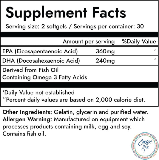 Carson Life DHA EPA Omega 3 Supplement - Brain Function Support Softgels - Made in USA - 60 Count