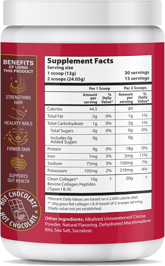Chocolate Collagen Peptides Powder - Grass Fed Hydrolyzed Type 1&3 for Hair, Skin, Nails, Bones, Joints - 30 Servings (Hot Chocolate)