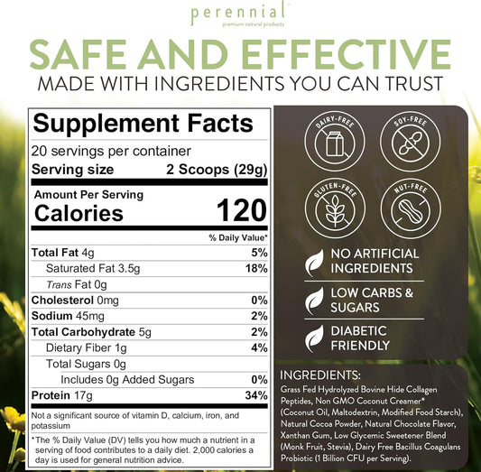 Chocolate Flavored Perennial Choice Collagen Protein Powder - Grass-Fed, Dairy-Free, Gluten-Free Formula for Skin, Joints, Muscle Recovery - 17g Protein per Serving - 20.5 oz