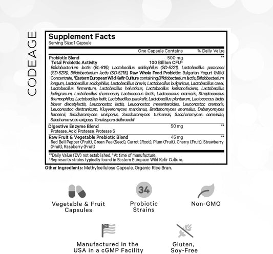 Codeage Raw Probiotic+ Supplement with 34 Probiotic Strains, 100 Billion CFUs, Digestive Enzymes, Prebiotics, Wild Kefir Culture - Non-GMO - 30 Capsules