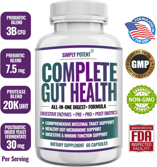 Complete Gut Health: Digestive Enzymes, Prebiotic, Probiotic & Post Biotic Support (60 Capsules)