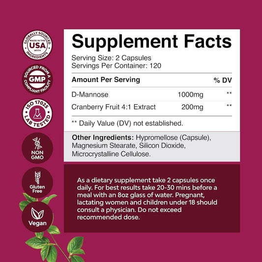 D-Mannose with Cranberry Extract Capsules - 1000mg per Serving - Kidney Cleanse and UTI Support for Women - 4 Month Supply