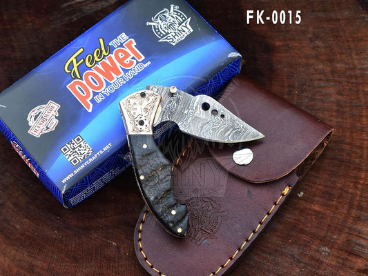 Damascus Hunting Pocket Knife for Men with Leather Sheath - Everyday Carry Tactical OTF Knife - Shiny Crafts FK 15