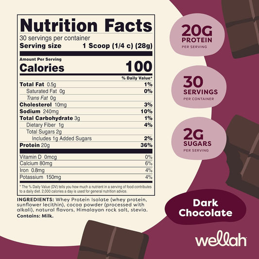 Dark Chocolate Whey Protein Isolate Powder - 30 Servings by Wellah Protein