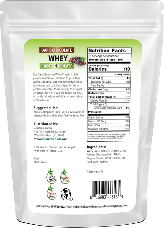 Dark Chocolate Whey Protein Isolate Powder - Zero Sugar, All Natural, Hormone Free - Gluten Free - 1 lb