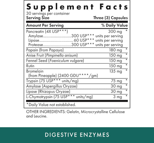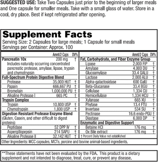 Digestive Enzyme Supplement with Mycozyme, Pancreatin, Papain, Acid Stable Protease, Betaine HCl, and Iron Bile Salts for Daily Digestive Support