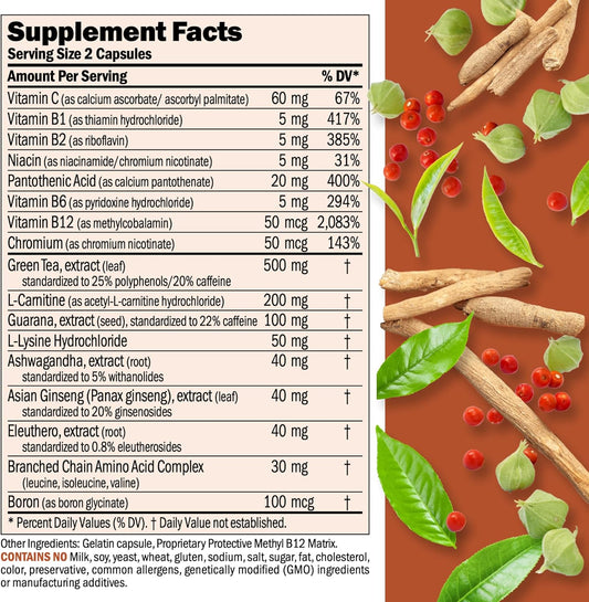 Energy and Fat Metabolism Support Supplement - Boosts Fat Burning and Energy Metabolism with Carnitine, Green Tea, Guarana, Ginseng, B-Complex - 30 Easy-to-Swallow Capsules
