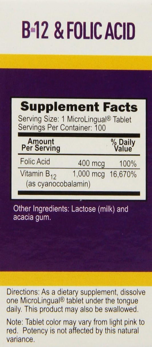 Energy Boosting Vitamin B-12 & Folic Acid Tablets for Heart, Brain, & Stress Support - 100 Sublingual Dissolving Tablets