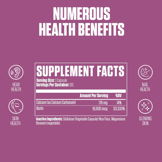 EPN Supplements Biotin Pure 10,000 MCG + Calcium | High Potency Biotin B7 Pills for Hair, Skin & Nails | Vegan Capsules for Men & Women - 60 Servings