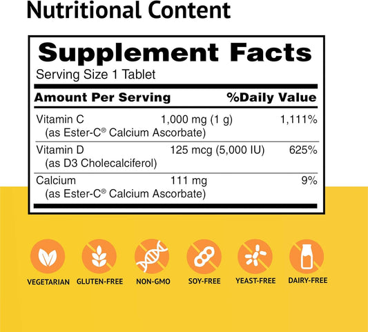 Ester-C EsterC with D3 Bone Immune Complex Vegetarian Tablets - 1000mg EsterC & 5000IU Vitamin D3 - 24 Hour Immune Support - Non-Acidic Vitamin C - 60 Count