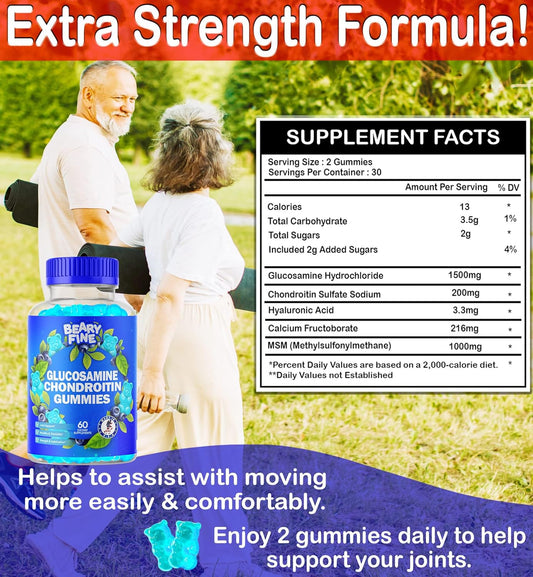 Extra Strength Beary Fine Glucosamine Chondroitin Gummies with MSM for Joint Support - 60 Supplements for Men & Women - Made in USA