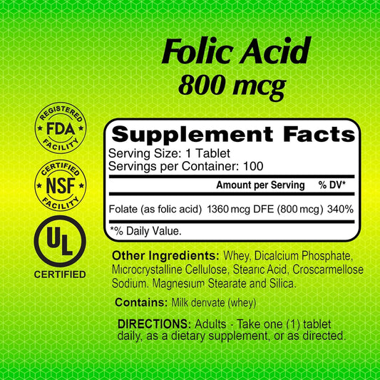 Folic Acid 800 mcg Tablets - 100 Count - Nature's Blend Formula