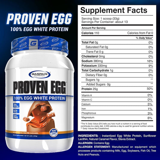 Gaspari Nutrition Proven Egg White Protein Powder - 25g Protein, Keto, Dairy, Lactose, Soy Free - Salted Caramel Flavor - 1lb