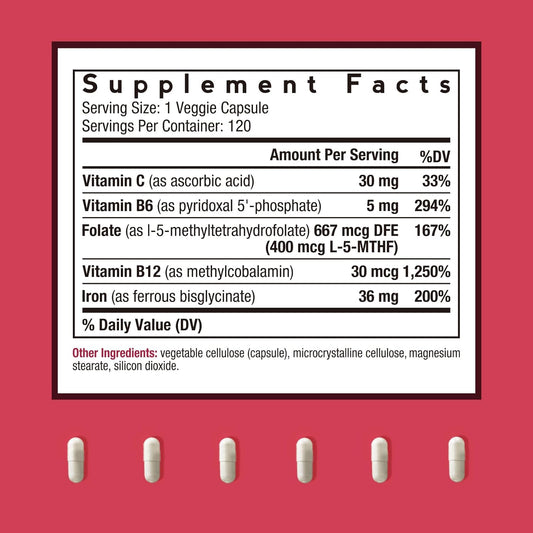 Gentle Iron Supplement for Women and Men with Vitamin C, B6, Folate & B12 - Non-Constipating Vegan Capsules for Blood & Energy Support