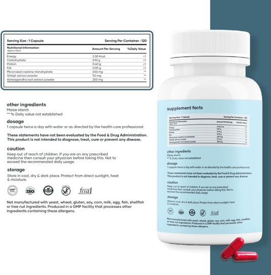 GHC Micronized Creatine Monohydrate Capsules with Shilajit & Ashwagandha - 120 Count - Pure & Natural - Overall Wellness