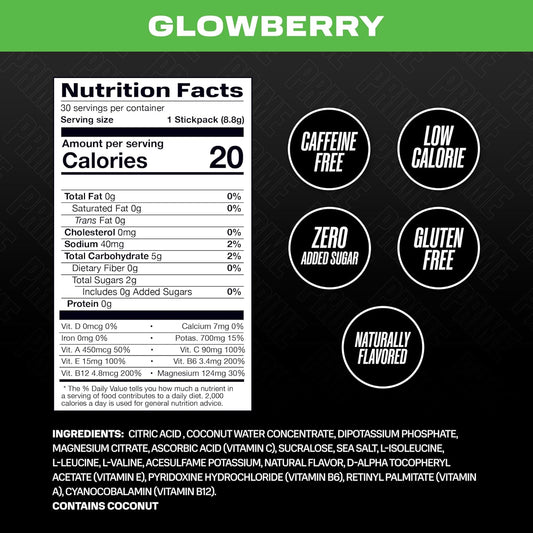 GLOWBERRY Prime Hydration+ Stick Pack - 6 Sticks, Electrolyte Drink Mix with Coconut Water, BCAAs, Antioxidants, Naturally Flavored, Zero Sugar