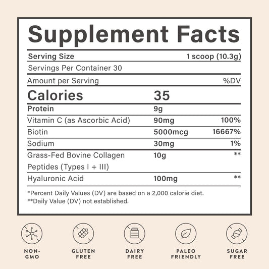 Grass Fed Collagen Powder with Biotin & Hyaluronic Acid for Hair, Skin, Nails & Joints - 30 Servings, Gluten & Sugar Free