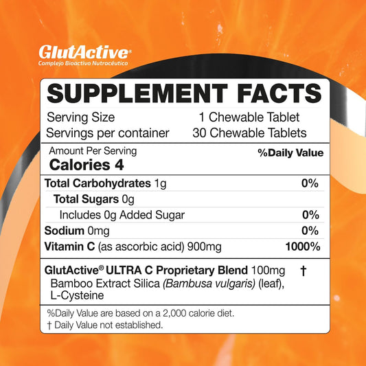 High Absorption GlutActive Ultra VIT-C 1,000mg Chewable Tablets - Immune Support & Collagen Builder - Antioxidant - 30 Tablets
