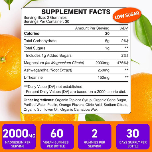 High Absorption Magnesium Citrate Gummies with Ashwagandha & L-Theanine - 2000mg, Calm and Relaxing Magnesium Gummy for Rest and Nerve Support, 9 Pack