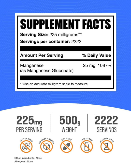 High Absorption Manganese Gluconate Powder - Essential Trace Mineral Supplement, Gluten-Free, 225mg per Serving, 500g (1.1 lbs) Pack