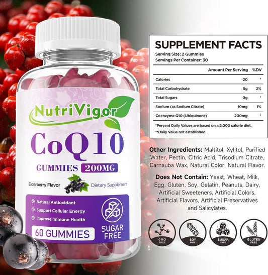 High Absorption NutriVigor CoQ10 Gummies - 200mg Supplement for Cellular Energy & Immune Health - Vegan & Gluten Free - Elderberry Flavor - 60 Count